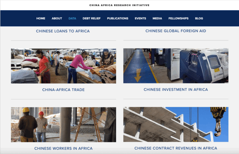 La China Africa Research Initiative, de l’Université Johns Hopkins, propose des données exhaustives sur les investissements directs étrangers (IDE) Chine-Afrique, leurs échanges commerciaux, leurs contrats, les investissements dans l’agriculture, l’aide extérieure et la main d’oeuvre chinoise dans les pays africains, ce qui permet d’en savoir plus sur la portée et les modalités de la présence chinoise sur le continent africain.
