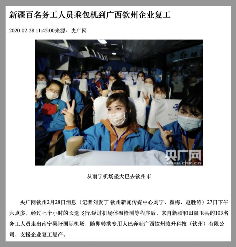 Capture d’écran d’un post sur le site de la Radio nationale chinoise (CNR), annonçant que du personnel originaire du Xinjiang s’est rendu en avion dans la province du Guangxi pour reprendre le travail dans des entreprises de technologie. Image : capture d’écran, CNR