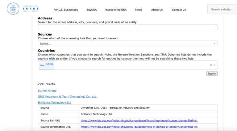 Les bases de données sur les contrôles des exportations du Ministère du commerce américain et autres agences répertorient les restrictions qui touchent les entreprises chinoises. Elles sont révélatrices des craintes relatives au transfert de technologies et des relations d’affaires qui mettent en lumière la dynamique de concurrence en matière de stratégie. La Entity List du Bureau américain de l’industrie et de la sécurité (Bureau of Industry and Security, BIS), la principale base de données, contenait quelque 600 entreprises chinoises en 2022, notamment des entreprises et des organismes de recherche actifs dans les domaines de la technologie militaire, de la 5G, de l’IA et autres technologies de pointe. La Consolidated Screening List (CSL), également gérée par le Ministère du commerce américain, propose un outil de recherche exhaustive qui vient en renfort des onze listes de sélection des exportations des Ministères du commerce, du Département d’Etat State et du Trésor, ce qui permet aux journalistes de contrôler efficacement les entreprises chinoises dans de nombreuses situations restrictives.