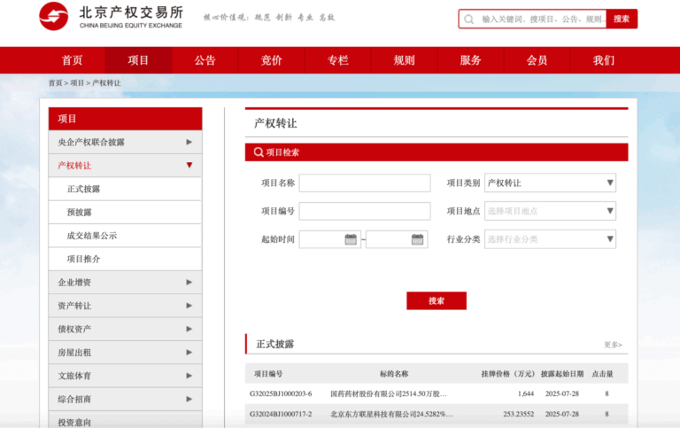 Les entreprises d’Etat doivent procéder à des transactions publiques et donner des informations quand elles transfèrent des droits de propriété, notamment des fonds propres, des créances et des immobilisations. Les transferts de droits de propriété permettent souvent de pouvoir avoir accès pour la première fois à des informations concernant des entreprises non publiques. La plupart des provinces et des municipalités chinoises disposent d’un centre d’échange des droits de propriété, qui publie les détails des transactions sur des sites officiels. Beijing Equity Exchange et Shanghai United Assets and Equity Exchange traitent le plus grand nombre d’échanges, en particulier les transactions liées aux grandes entreprises d’Etat. Les informations fournies portent sur les structures de fonds propres, les données financières et les détails des transferts, ce qui offre une occasion unique d’en apprendre davantage sur des entreprises généralement peu transparentes.
