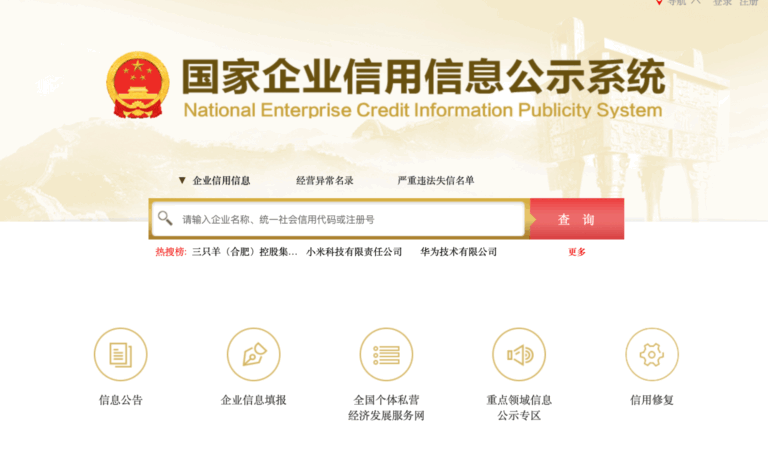 En Chine, toutes les informations des entreprises sont conservées dans des dossiers exhaustifs qui font office de documentation juridique auprès des agences de réglementation gouvernementales, connues en Chine continentale sous le nom d’archives économiques et commerciales. Les agences de réglementation publient sur des sites spécialisés un certain nombre d’informations élémentaires sur les entreprises, notamment les noms des actionnaires, les noms des dirigeants et les changements concernant les fonds propres. Le Système national d’information des crédits aux entreprises (National Enterprise Credit Information Publicity System) est le premier point d’accès public pour obtenir ce genre d’information. Il propose des données officielles concernant l’enregistrement des entreprises, notamment la date de création, le capital social, les représentants légaux, le champ d’activité et les sanctions administratives, et ce, dans toutes les provinces et toutes les municipalités de la Chine (vous trouverez dans la deuxième partie de ce guide des conseils sur l’utilisation des outils qui permettent de trouver des renseignements sur les entreprises).