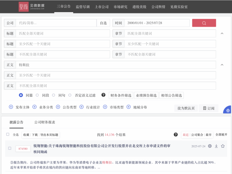 Des plateformes comme Jianwei Data se distinguent en la matière, en convertissant en format texte toutes les informations sur les annonces faites par les entreprises, notamment les rapports d’évaluation en format image. Il suffit de taper “Tesla” dans le champ de recherche et l’on obtient toutes les annonces faites par les entreprises publiques qui comportent ce mot clé. Si l’on consulte les annonces faites par Shanghaï, Shenzhen et le National Equities Exchange and Quotations, les recherches sur “Tesla” donnent 14 136 résultats, avec des options de filtrage supplémentaires pour un ciblage plus précis.