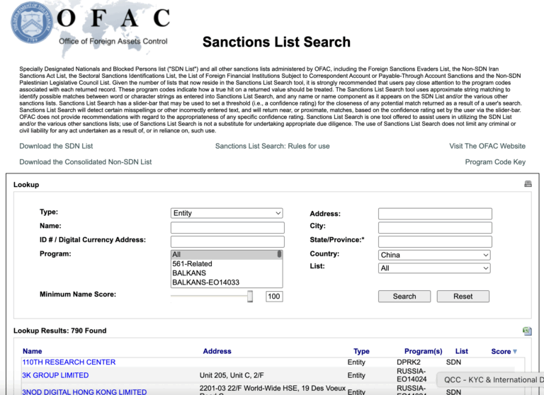 La liste de sanctions du Bureau de contrôle des avoirs étrangers (Office of Foreign Assets Control, OFAC) du Trésor américain comprend les justifications détaillées et les informations sur les réseaux d’entreprises qui concernent les entreprises chinoises. On y trouve souvent des historiques complets sur les relations d’affaires et les manquements présumés. Le EU sanctions tracker propose un point de vue européen sur les entreprises chinoises soumises à des restrictions. Il offre souvent des historiques ainsi que des arguments qui viennent en complément de la documentation américaine.
