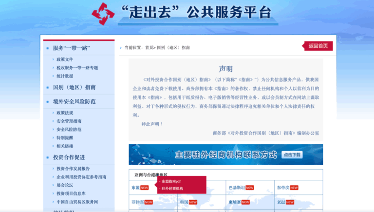 La Plateforme des services publics ‘Going Out’ mise en place par le Ministère du Commerce propose des conseils exhaustifs aux journalistes qui souhaitent avoir accès non seulement aux statistiques concernant le commerce bilatéral, mais aussi aux informations détaillées sur la sous-traitance de contrats, qui révèlent quelles entreprises chinoises obtiennent d’importants contrats à l’international.