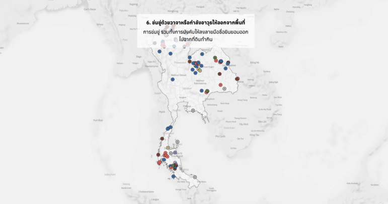 थाईलैंड में वन क्षेत्र पर पंच-अप के विशेष फ़ीचर का एक इंटरैक्टिव रेखांकन। इसमें ग्रामीणों को प्रभावित करने वाले मामलों का विवरण है। इमेज : स्क्रीनशॉट