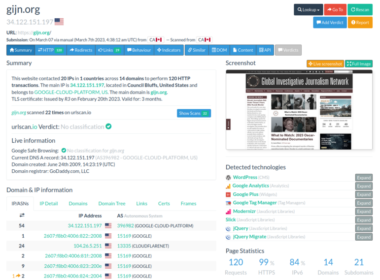 gijn.org की यूआरएल-स्कैन क्वेरी का परिणाम। इमेज : स्क्रीनशॉट, यूआरएल-स्कैन