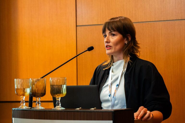 Florence Wild, chief development officer at CORRECTIV, speaking at the GIJC25 in Kuala Lumpur. Image: Zahid Hassan for GIJN