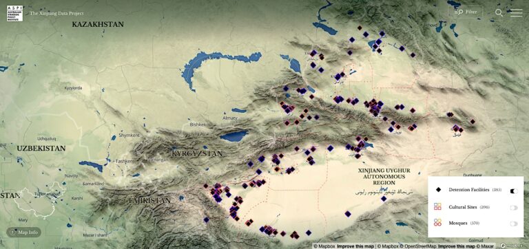 Çin, Sincan Uygur Özerk Bölgesi’nde Kazakistan, Kırgızistan ve Tacikistan’ın doğu sınırları boyunca yüzlerce gözaltı merkezi inşa etti; bu durum, söz konusu ülkeleri Çin baskısından kaçan mülteciler için yaygın bir sığınak hâline getirdi. Görsel: Ekran görüntüsü, Xinjiang Data Project, Avustralya Stratejik Politika Enstitüsü.