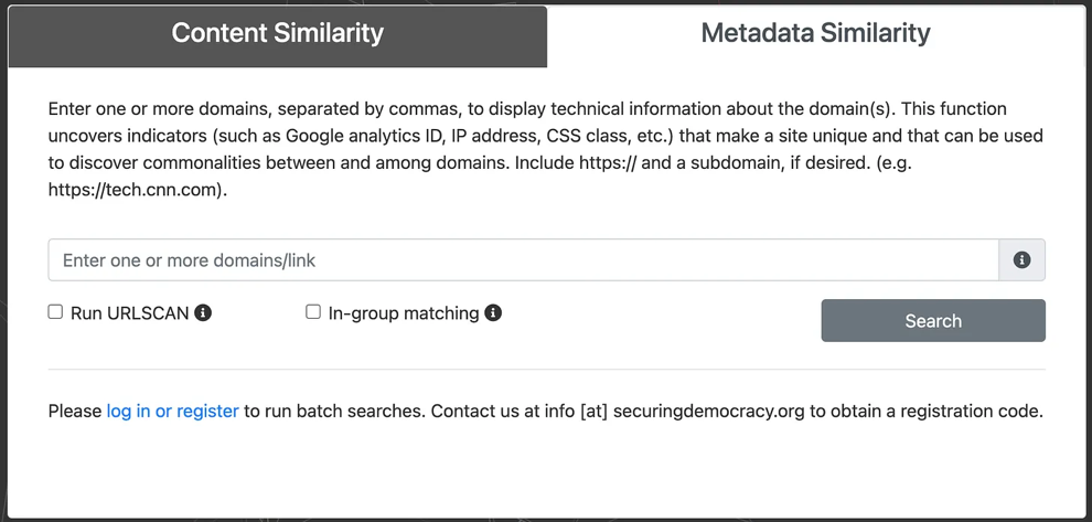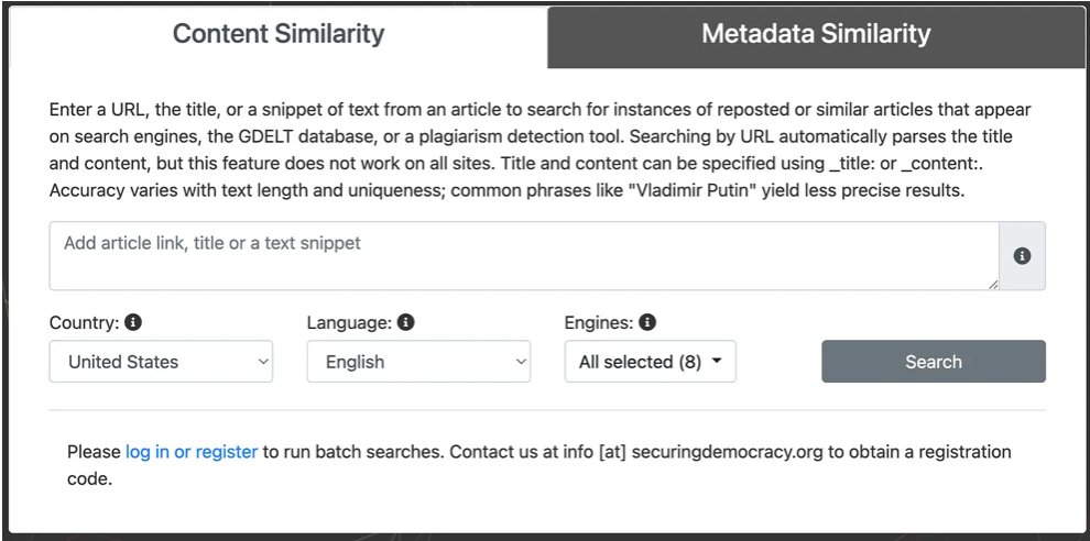 Інструмент аналізує посилання, заголовок або фрагмент тексту, щоб виявити інші вебресурси зі схожим або ідентичним контентом. Він допоміг Альянсу за безпеку демократії в пошуку вебсайтів, які постійно копіюють матеріали з Russia Today (RT). У дослідженні вдалося виявити сайти, які постійно передруковували контент RT і допомагали просувати RT-вські наративи в інтернеті, «відмиваючи» їх.