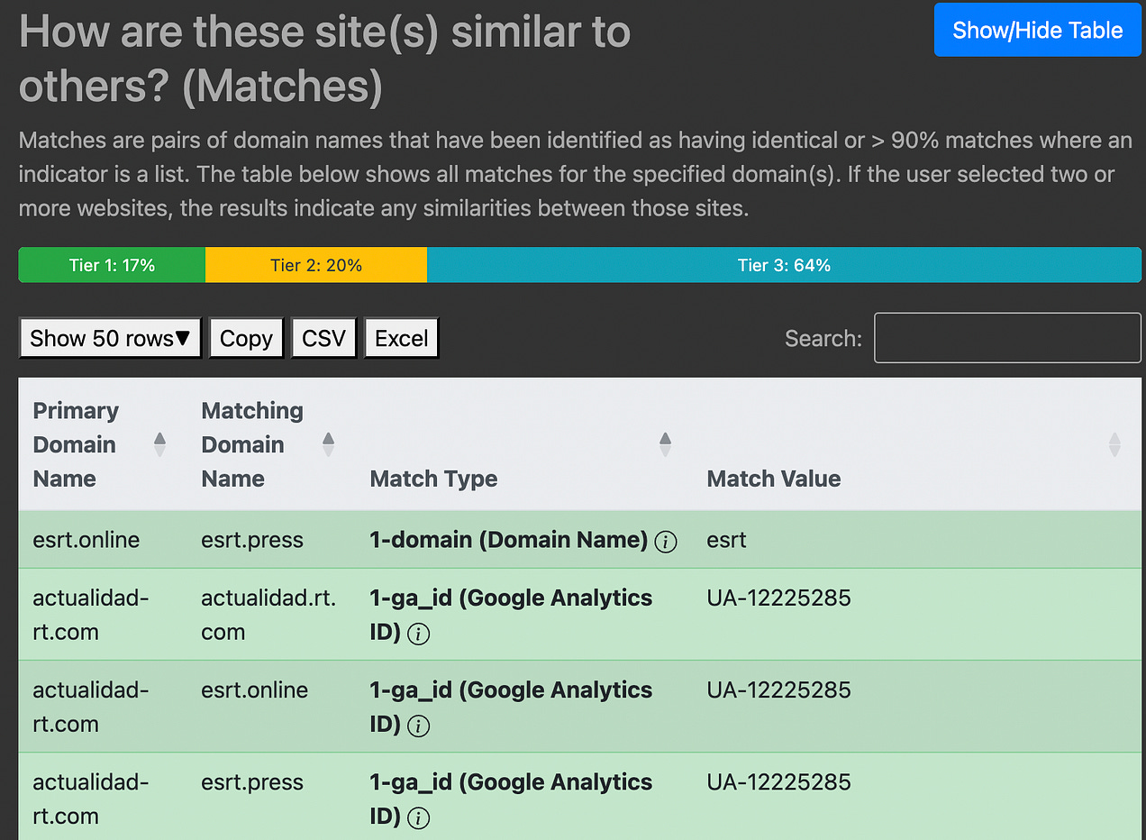 - Інструмент сканує кожен домен, зокрема його інфраструктуру, IP-адресу та вихідний код, щоб виокремити унікальні показники та визначити, чи є збіги між доменами. Він позначає прямі збіги IP-адрес, а також показує, чи розміщені сайти в одному діапазоні IP-адрес (що є слабшим зв’язком, але все ж потенційно вартим уваги). Окрім пошуку унікальних рекламних та аналітичних кодів, інструмент сканує CSS-файл сайту на предмет схожості. Пітер сказав, що «має бути понад 90% схожих класів CSS», щоб інструмент позначив його як вартий уваги. (Повний список індикаторів сайту можна переглянути тут).