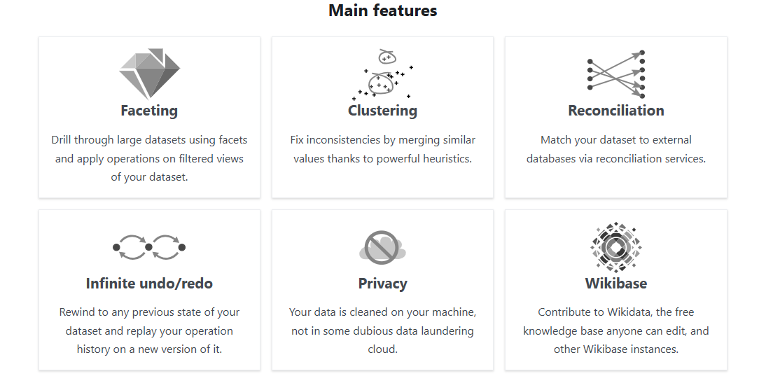 یہ ادارہ جاتی سطح پر ڈیٹا کلیننگ کا ایک طاقتور ٹول ہے۔ یہ اے آئی کی مدد سے (کلیننگ کی) سفارشات دیتا ہے؛ یہ خود ڈیٹا میں غلطیاں تلاش کرتا ہے اور ان کی درستگی کی آپشن دیتا ہے۔