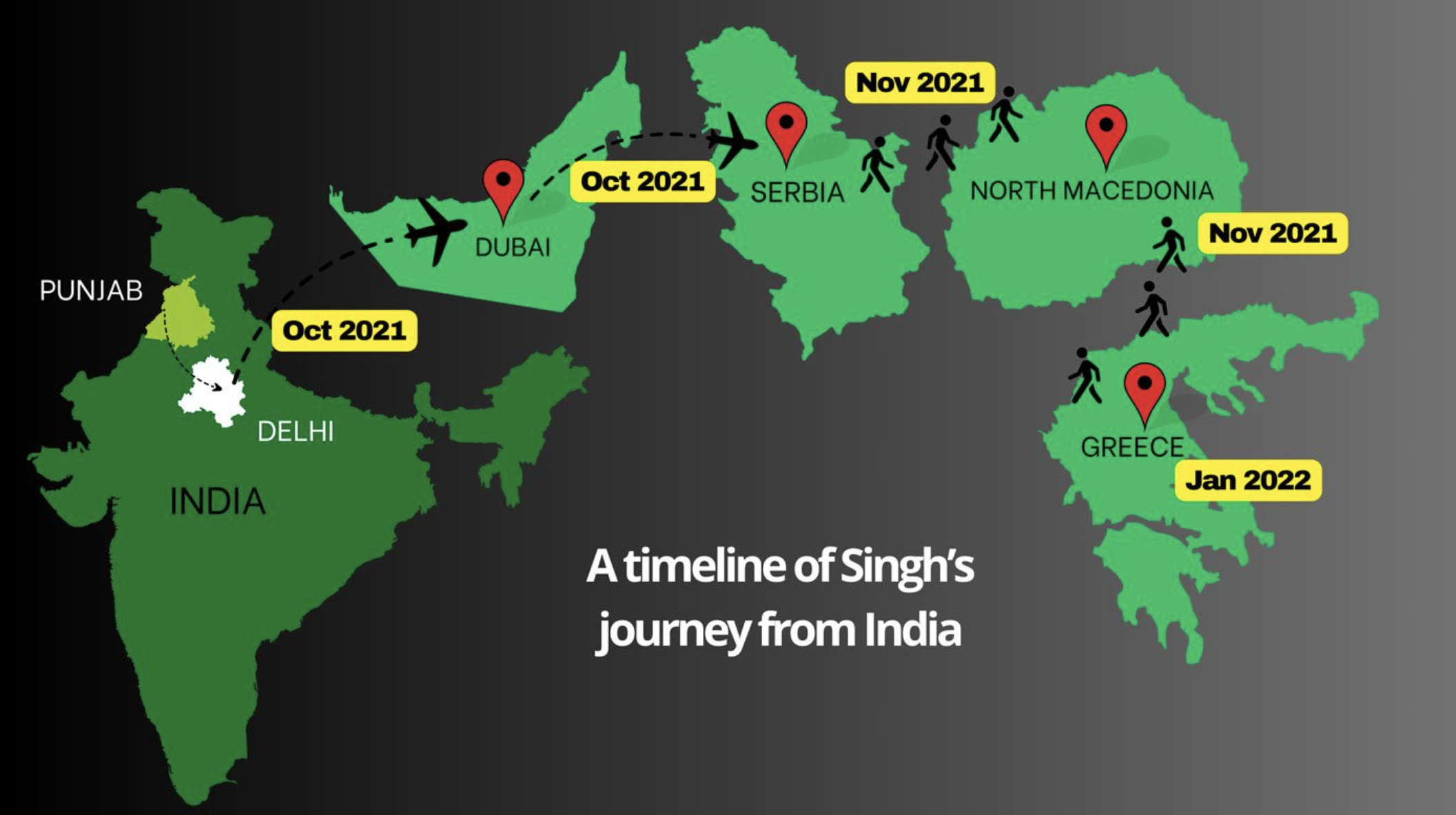 وہ سربیا کے راستے ہوتے ہوئے بحیرہ روم کے جزیرے پر پہنچے تھے جہاں اس وقت بھارتی شہریوں کو ویزا فری داخلے کی اجازت حاصل تھی۔ اپنے سفر کے دوران وہ جن اسمگلروں سے ملے تھے ان میں سے زیادہ تر جنوبی ایشیائی تھے جو خصوصاً مہاجرین کی اسمگلنگ کے لیے چھوٹے گیسٹ ہاؤسز اور نیٹ ورکس چلا رہے تھے۔ ’سنگھ‘ نے بتایا کہ ان کے خاندان نے اسمگلروں کی فیس ادا کرنے کے لیے اپنی زمین بیچ دی تھی اور انہوں نے خالی ہاتھ گھر واپس جانے سے انکار کر دیا تھا۔